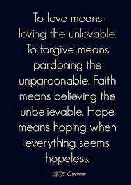To forgive means pardoning the unpardonable. Share Tweet Pin it Email WhatsApp To love means loving the unlovable. Faith means believing the unbelievable. To forgive means pardoning the unpardonable.